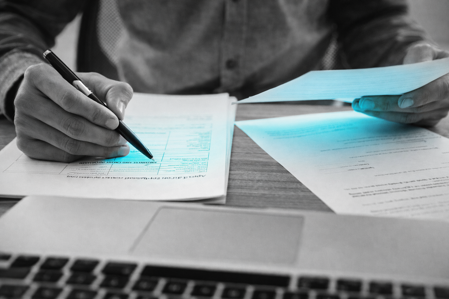 Mãos analisando e preenchendo documentos fiscais sobre uma mesa, em imagem em preto e branco com destaque seletivo em azul-esverdeado, representando análise tributária e revisão de créditos de ICMS.